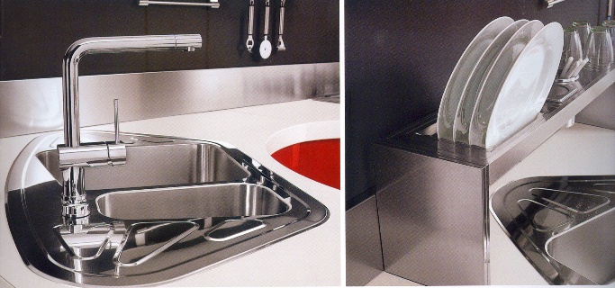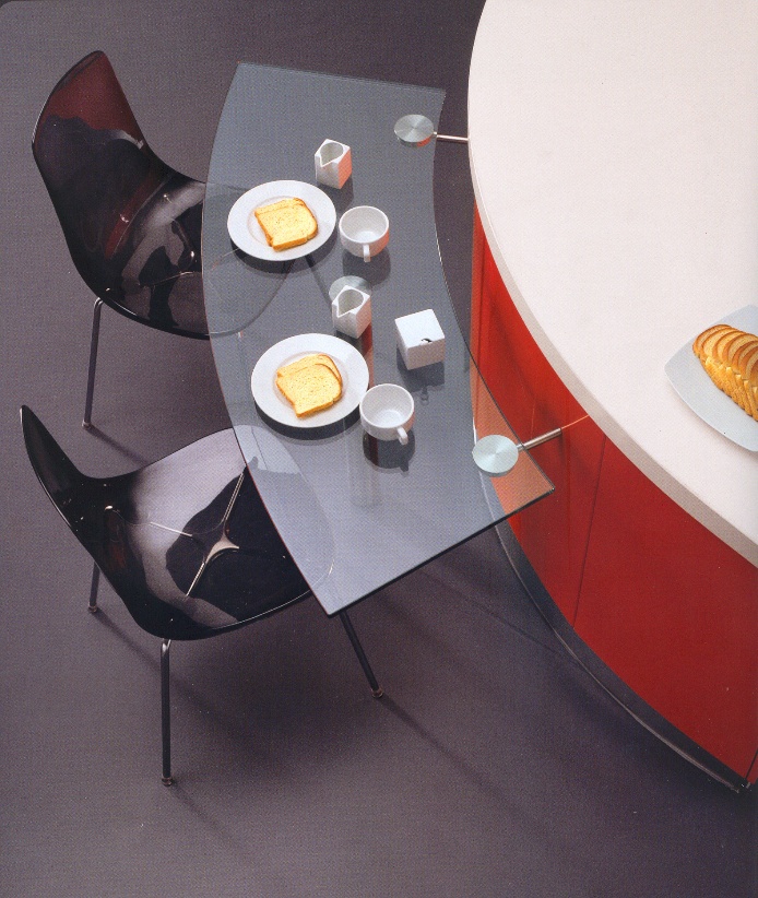 Une table sinueuse dans le prolongement du plan de travail, en verre et en acier, à hauteur réglable avec la possibilité d’y assortir les chaises ou tabourets.